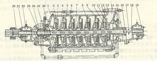1一進水段,2中段 3-升輪;4軸, 5- 導(dǎo)輪;6-承磨環(huán);7-葉輪擋套;8-導(dǎo)葉套;9-平衡盤;10-平衡套;11-平衡環(huán);12-出水段導(dǎo)輪;13-出水段;14-尾蓋;15-軸套乙;16-軸套螺母;17一擋水圉;18-平衡盤指針;19-軸承乙部件;20聯(lián)軸器;2l軸承甲部件;22-油環(huán);23-軸套甲,24~填料壓蓋;25-水封環(huán);26-拉緊螺栓